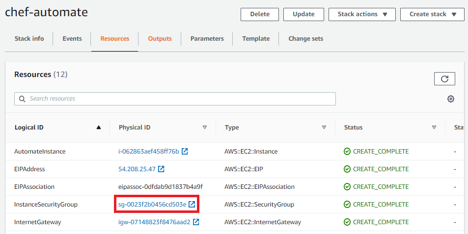 Select the Instance Security group in the Resources tab of your AWS Chef Automate deployment.
